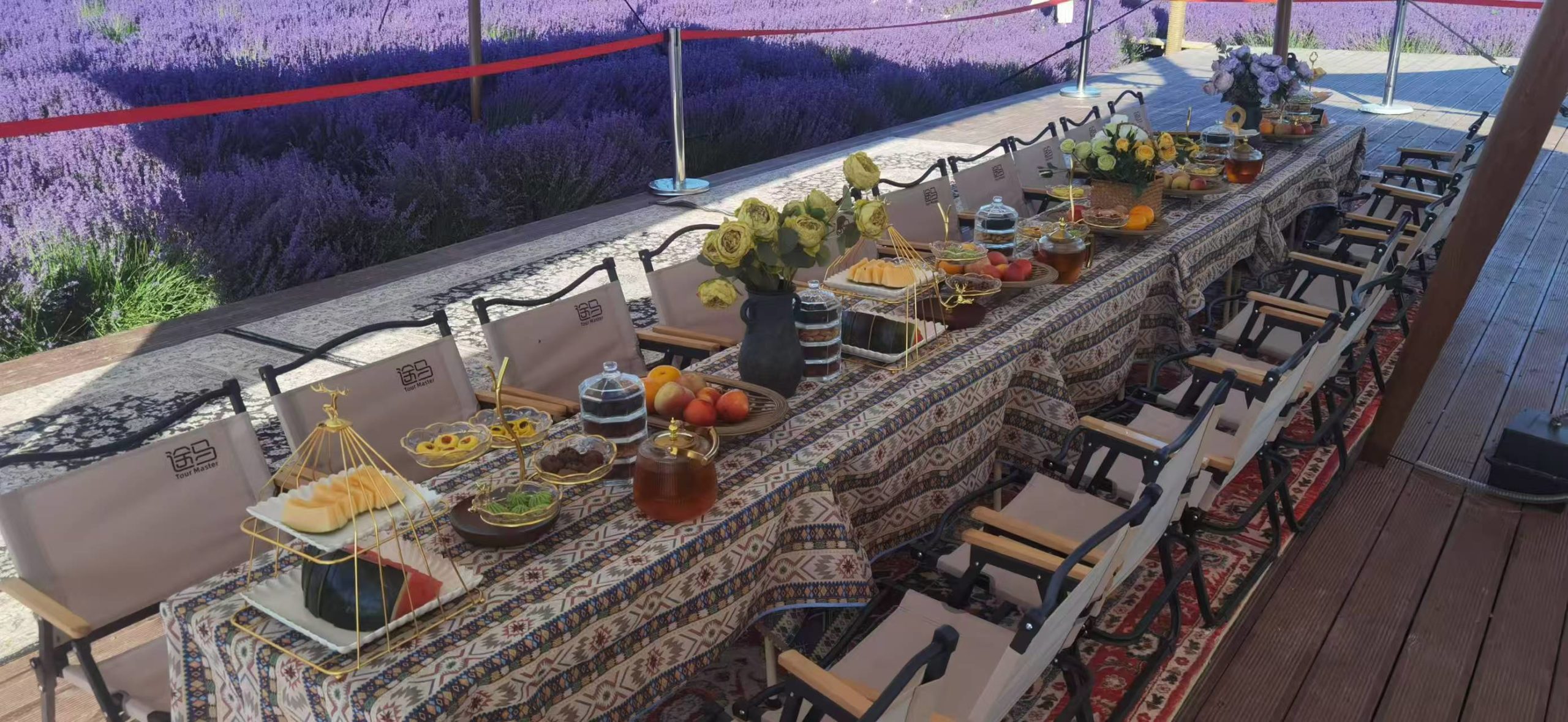 天山花海的午後,花田在夕光中鋪展開來,一層層延伸至遠方。帳篷靜立其間,燈光與微風交織,茶點在桌上緩緩展開。坐在花海之中,遠離喧囂,讓味覺與景色一同沉入這片柔和而寬闊的時光裡,感受一場屬於天山腳下的放鬆片刻。