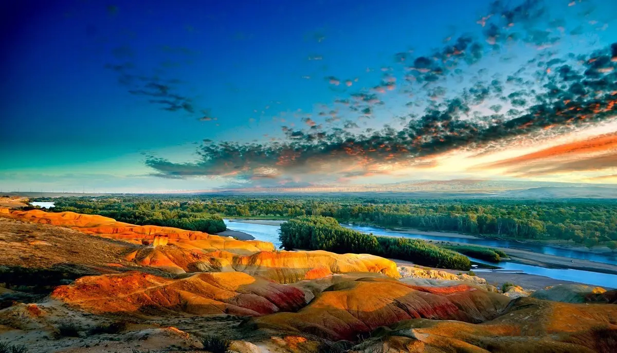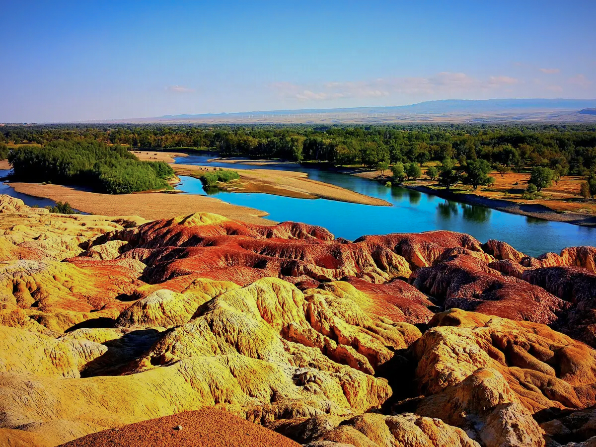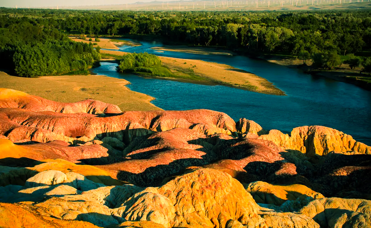 五彩灘位於額爾齊斯河北岸,因風蝕與礦物沉積形成層層堆疊的彩色土丘,地貌起伏分明。日光隨時間變化,岩層呈現紅、黃、橙等不同色澤,與對岸的河流、胡楊與綠洲形成鮮明對比。