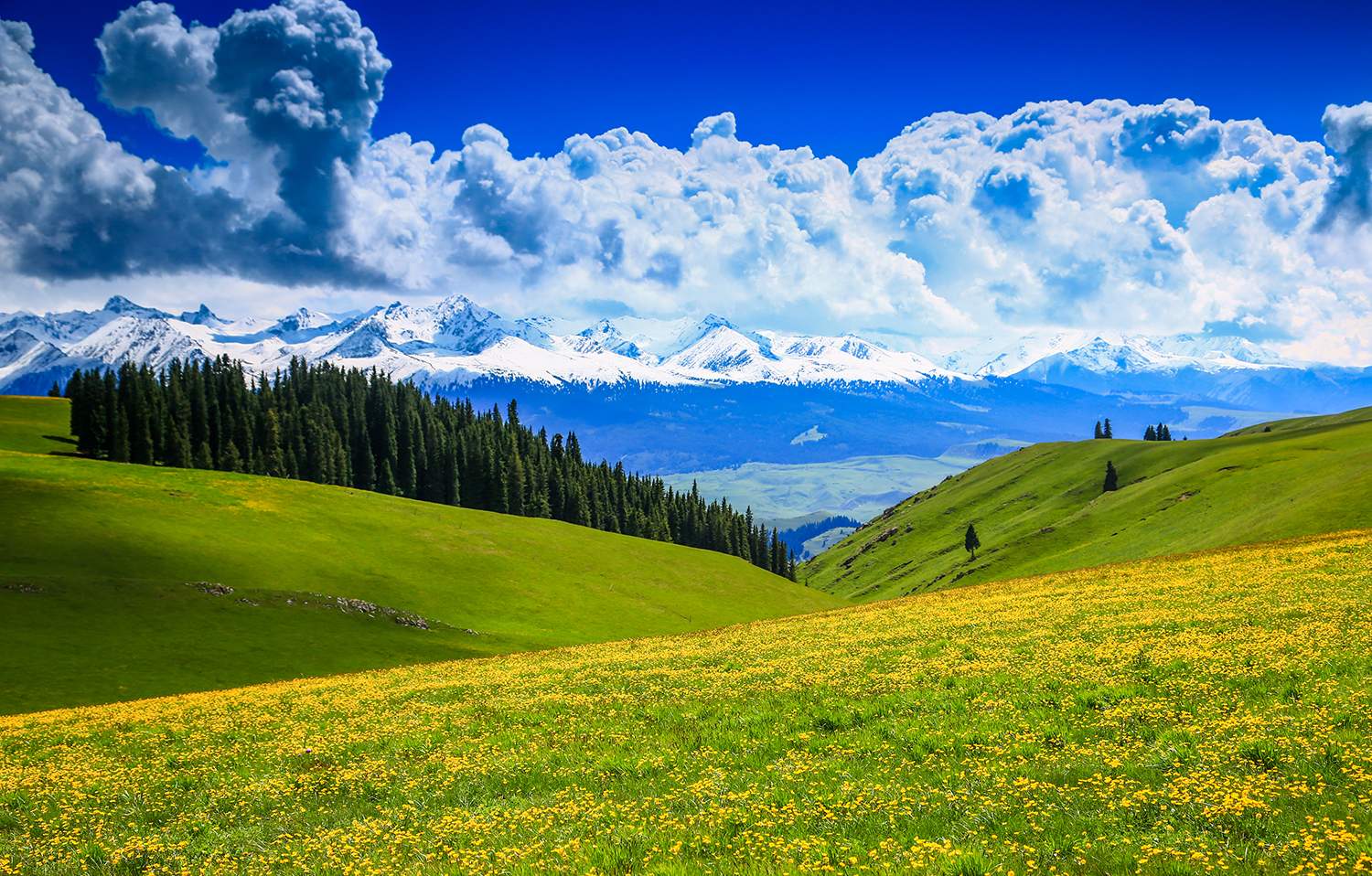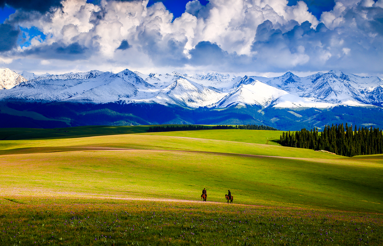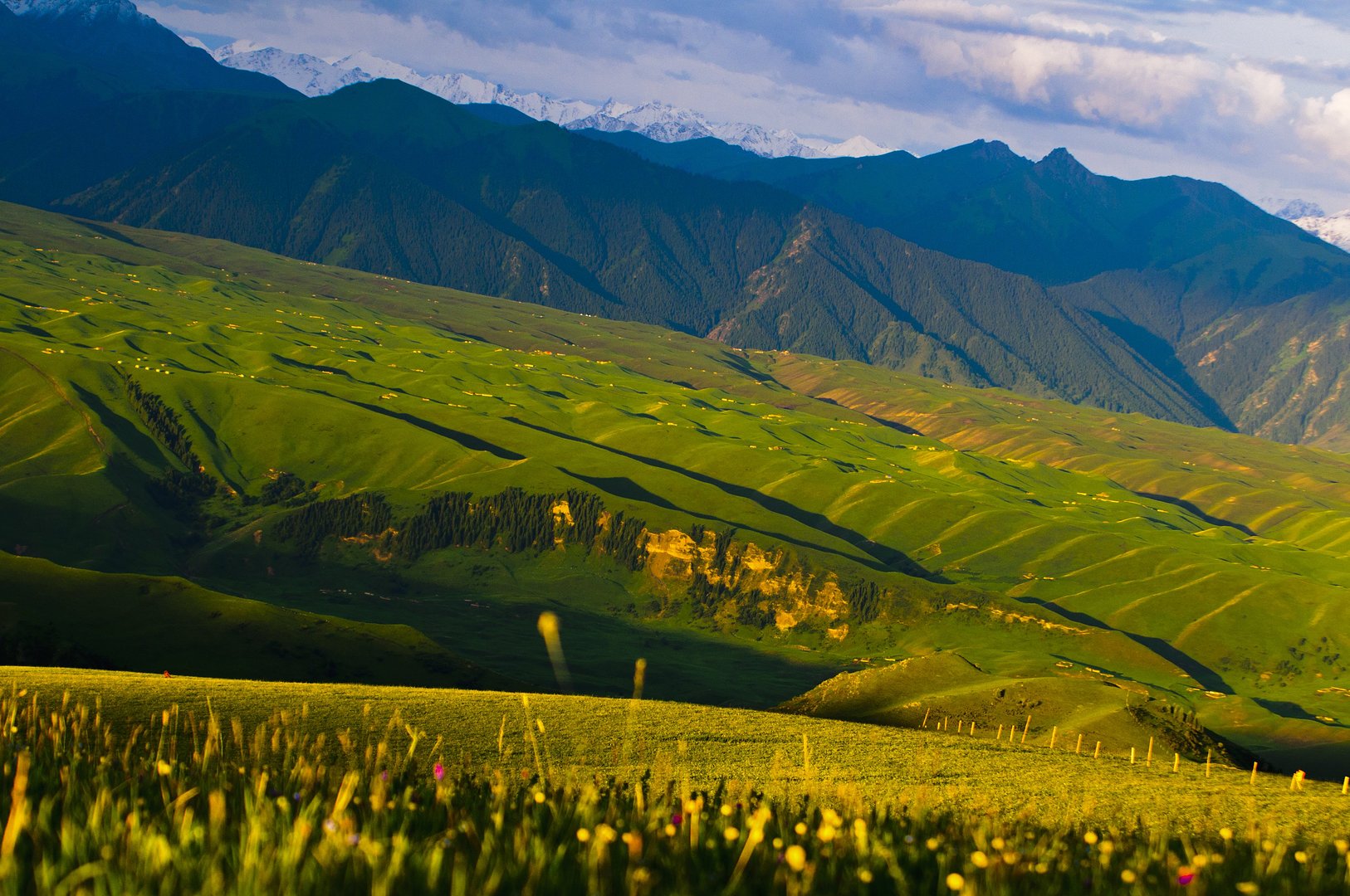 喀拉峻草原位於天山西段,是典型的高山五花草甸草原,地勢起伏連綿。不同種類的牧草與野花隨季節生長,讓草原呈現層次分明的綠意與色彩,彷彿花草的拼布。