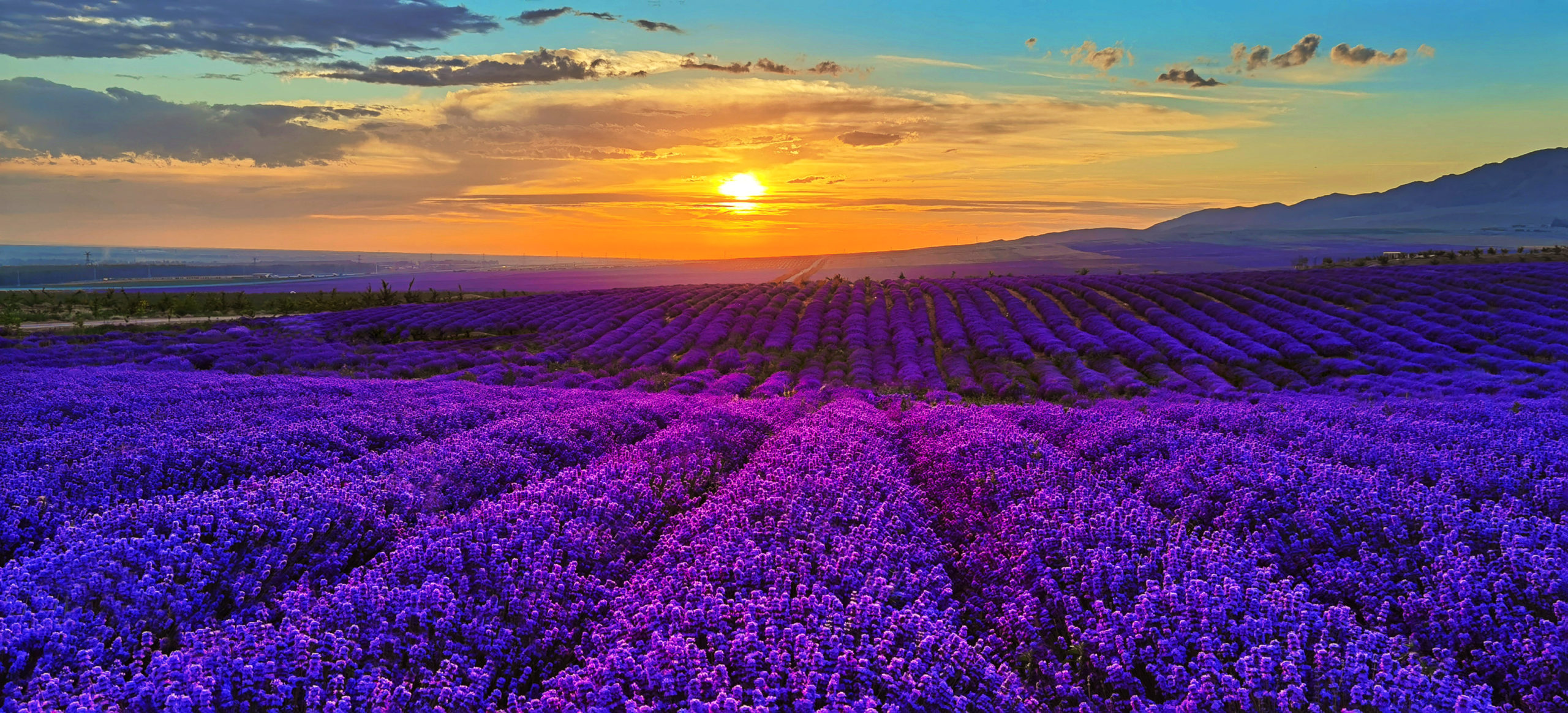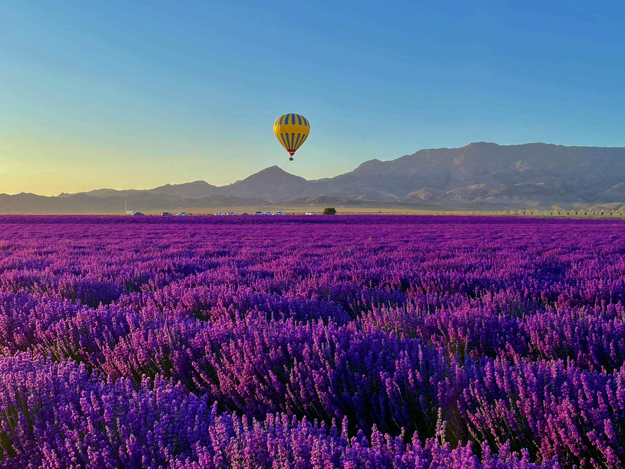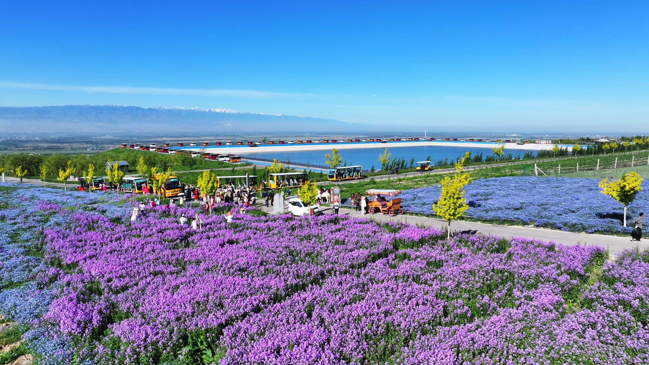天山花海位於天山山麓,佔地廣闊,隨著季節更替,花田在山腳鋪展開來。花與草地、山勢與天空自然交織,成層次分明的景觀,視線所及盡是流動的色。