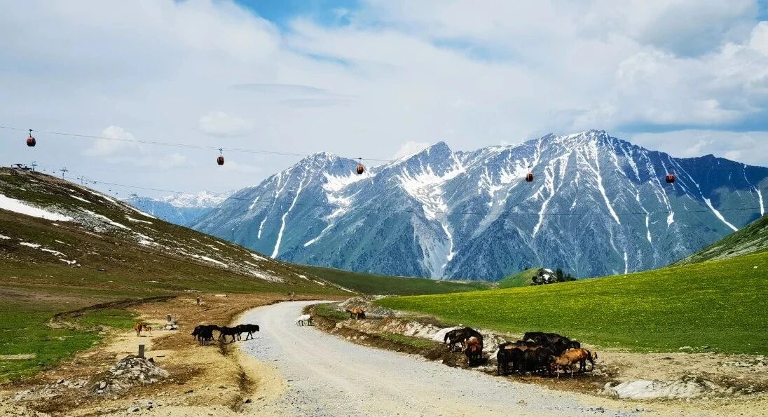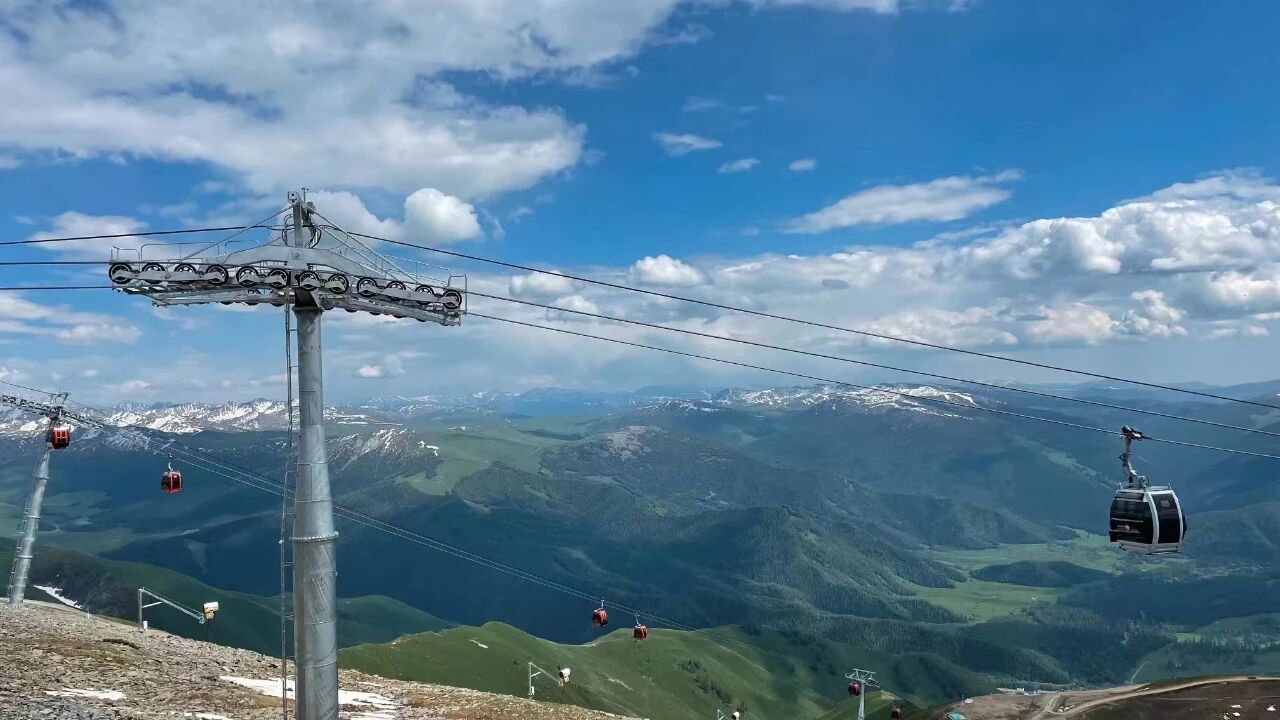 乘上雲霄峰纜車,自草原邊緣離地,掠過松林與山谷,視野隨高度一層層打開。腳下草原逐漸退遠,山勢輪廓慢慢浮現,直至海拔2800米的峰頂。抵達時,高山與草原同時展開在眼前,整片山野一覽無遺。