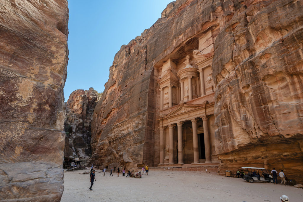 被當地貝因都人稱為「寶庫」的佩特拉卡茲尼神殿,傳說中神殿頂部有寶藏,所以才有此別稱,是古代最精美的神殿之一。而這裡也是「印第安納·瓊斯」系列電影第三部的取景地,其中尋找聖杯的經典場景就在這裡,希臘式的建築外觀,都是以岩石雕刻而成,神殿在不同陽光照射角度下呈現不同顏色,多了些許浪漫氣息。