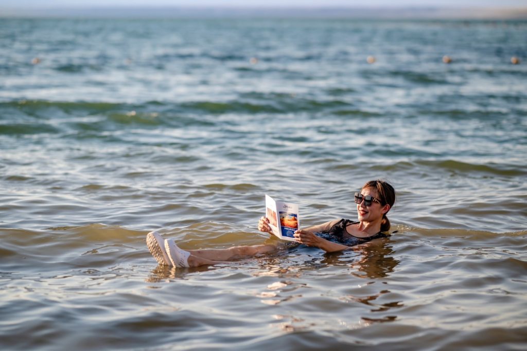 全世界海洋裡的鹽份只有3.5%,死海的鹽份則將近30%!到死海一遊,一定要享受死海泥護膚,拿一本「跟著董事長遊台灣」的月刊,在死海上享受漂浮看書的樂趣。