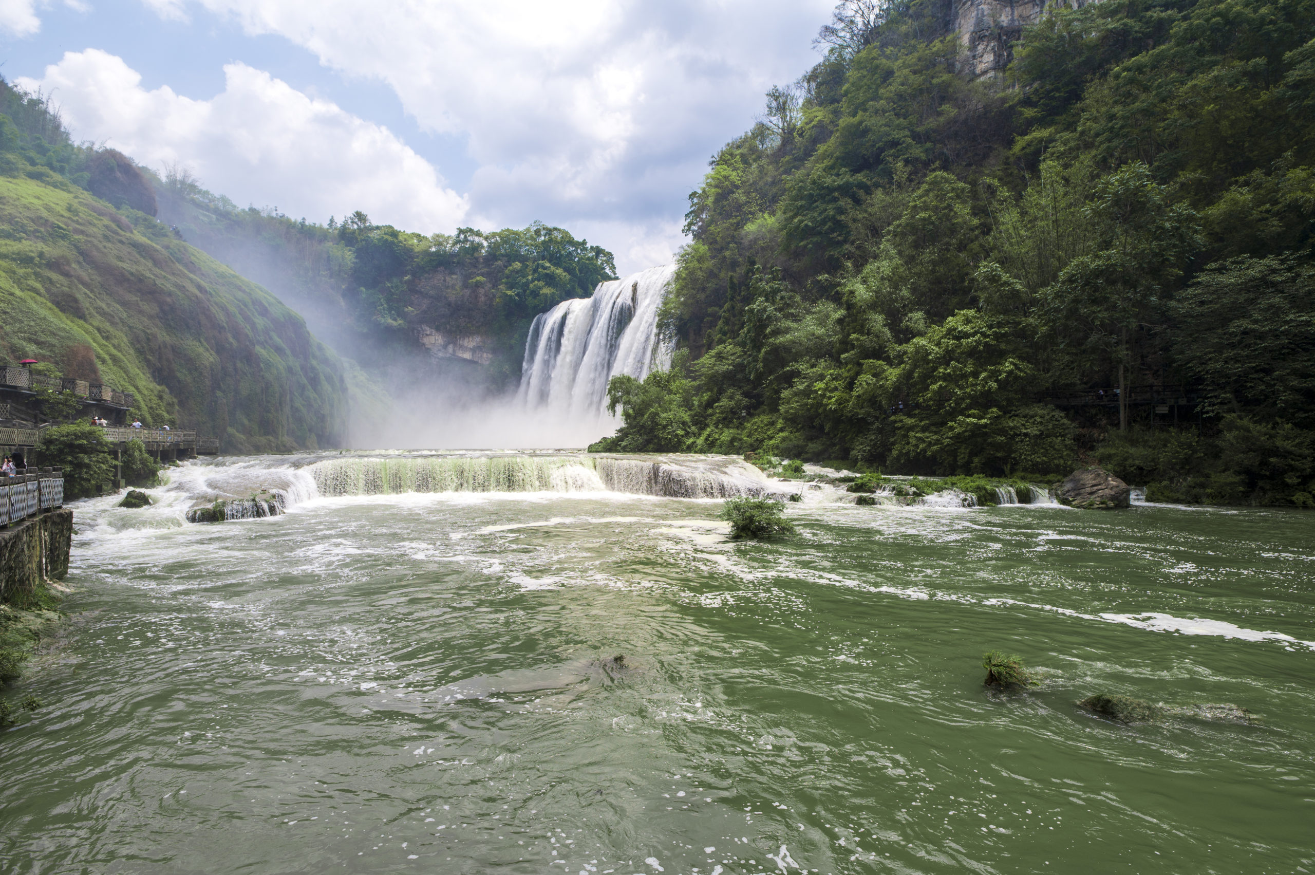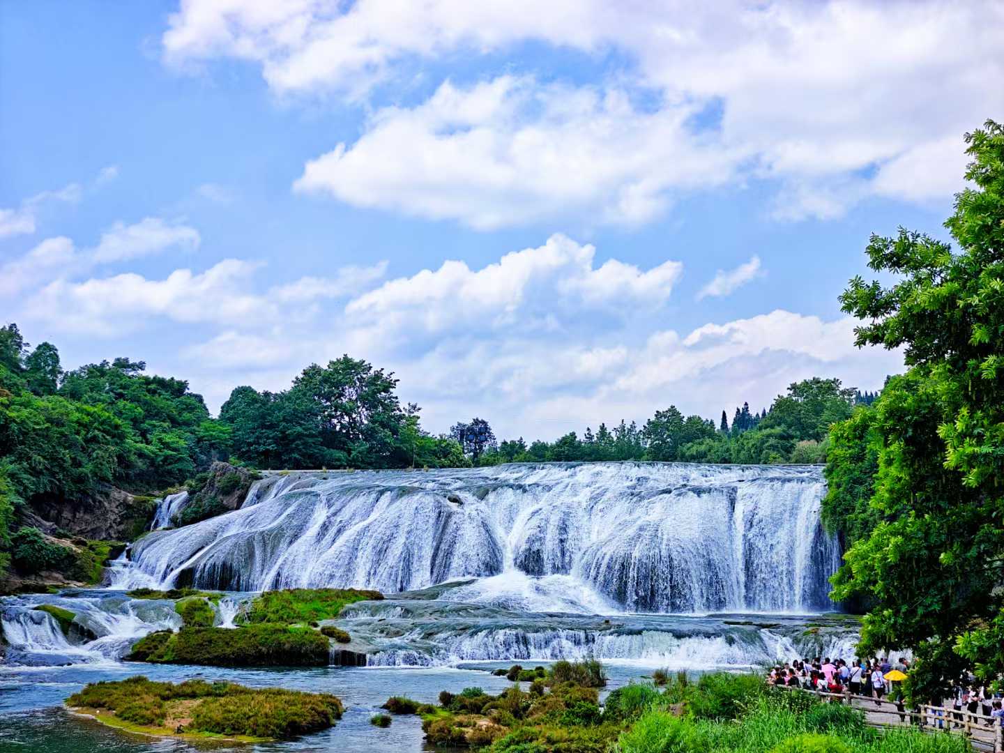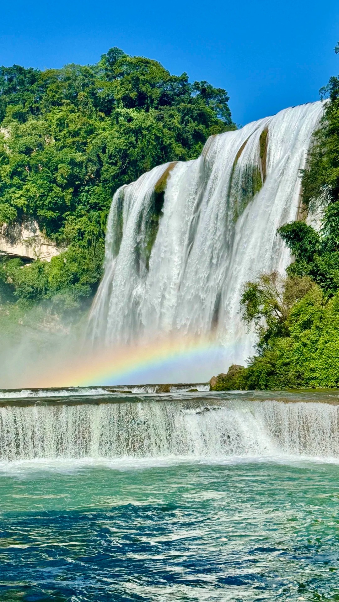 高77.8米、寬101米的黃果樹瀑布,雨季水勢洶湧、轟鳴如雷,主瀑如白練垂掛山谷,氣勢磅礴。瀑布周邊典型喀斯特地貌、青山翠谷環繞,與水光交織成絕美畫卷。