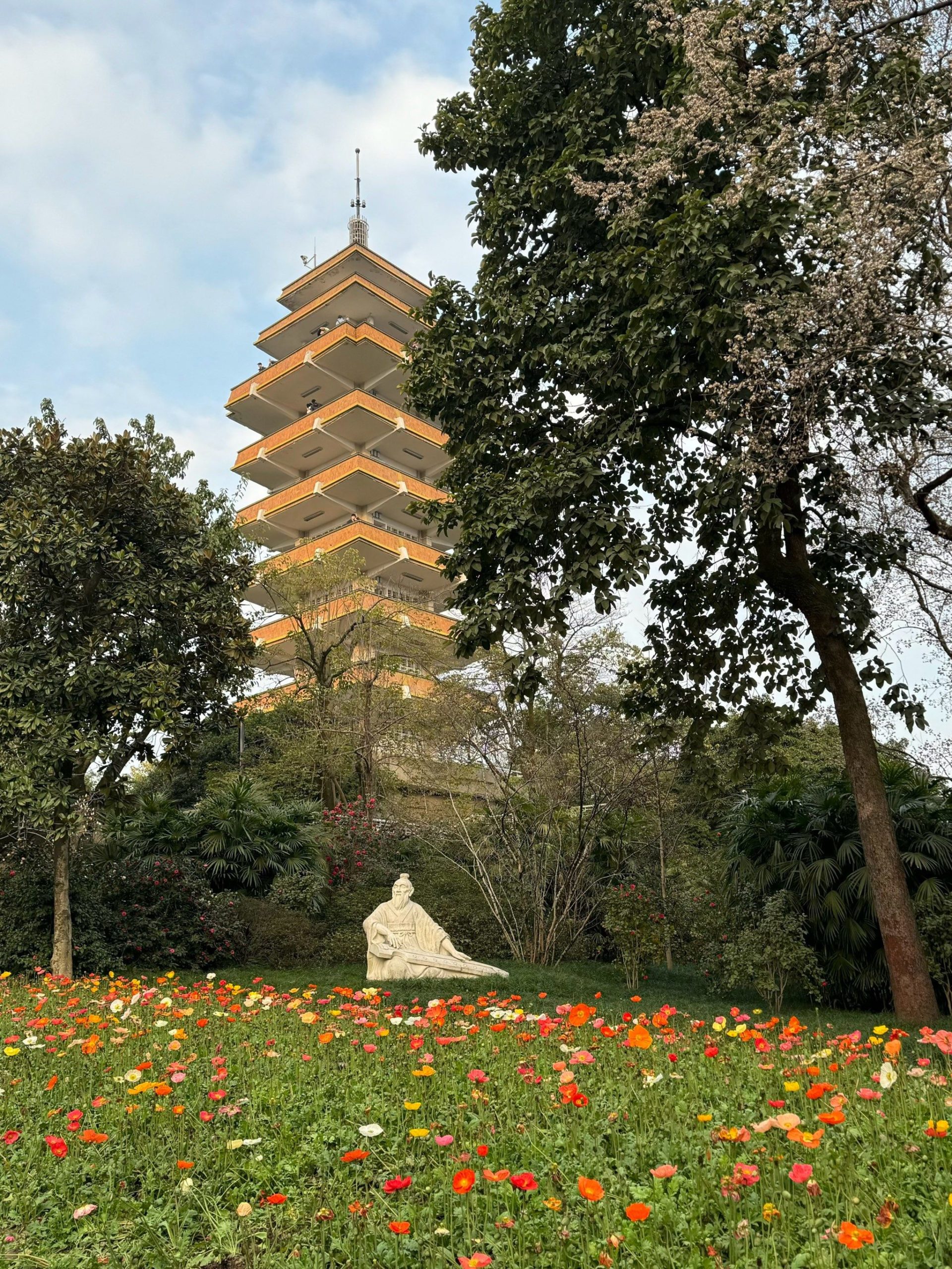 前身為禮園,亦稱宜園,因地處長江與嘉陵江挾持而過的陡峻山嶺上,形如鵝的頸項而得名。公園內飛閣建於西元1939年,曾為蔣中正與宋美齡居所及英國大使館駐地。