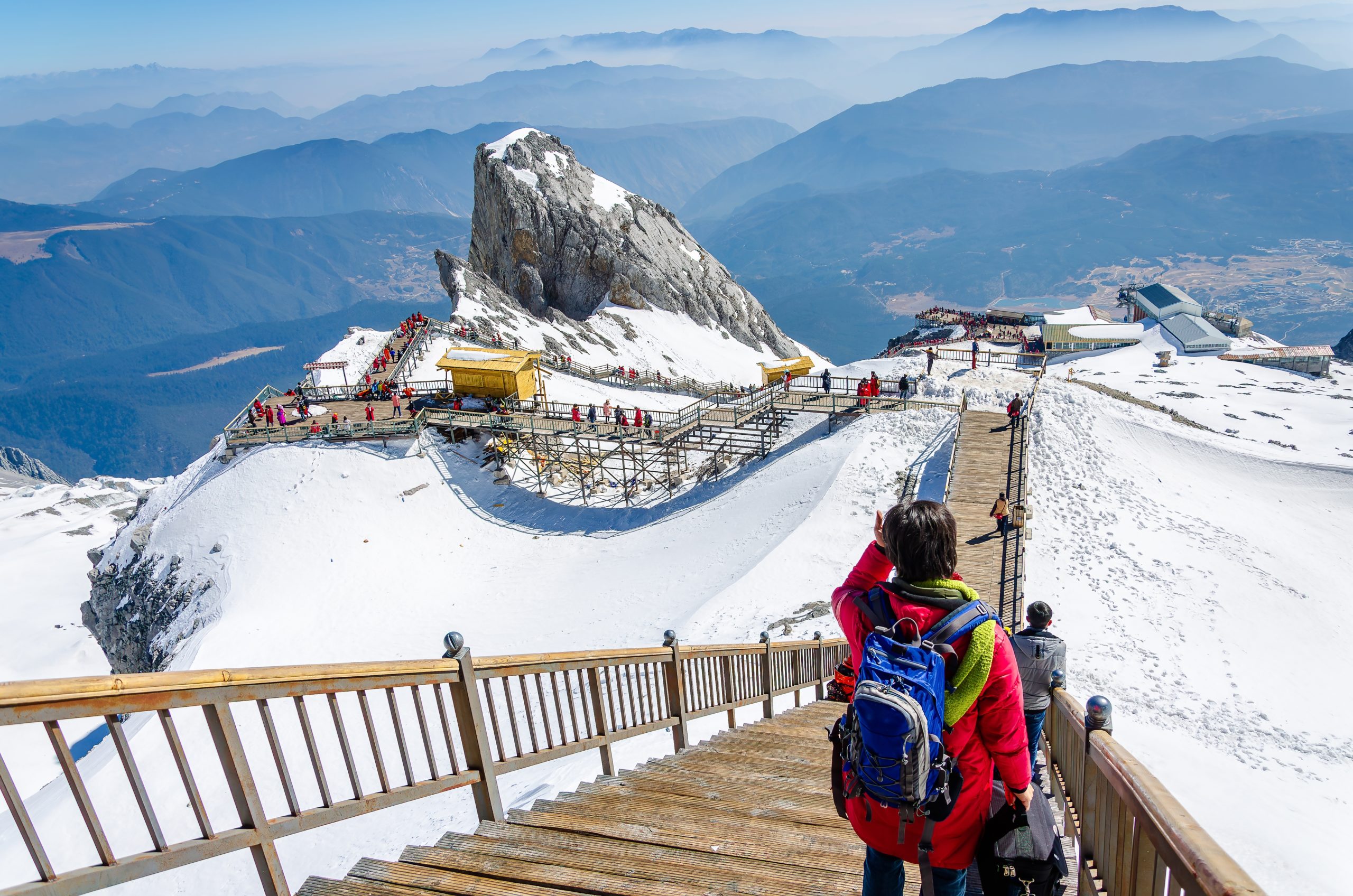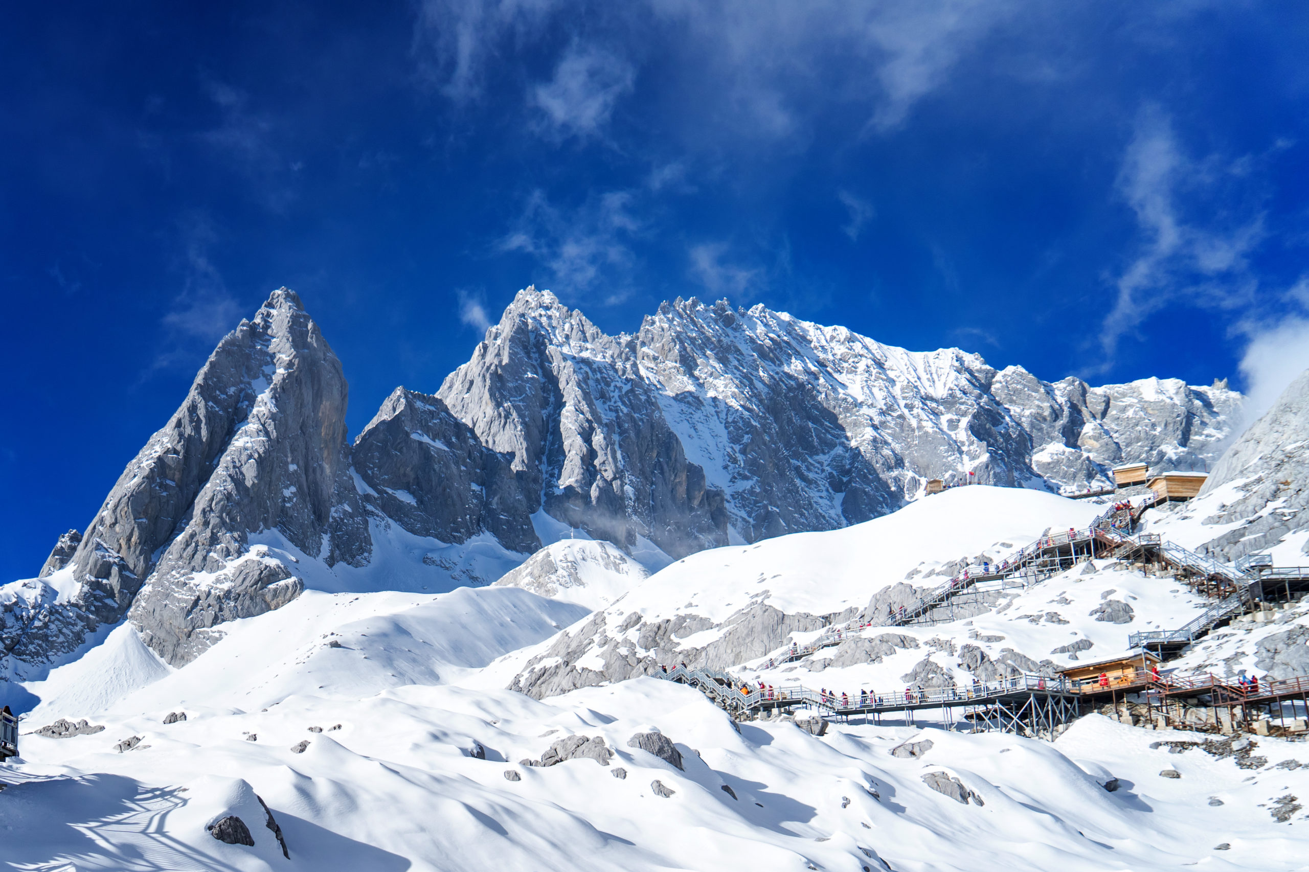 玉龍雪山主峰—扇子陡海拔約5596公尺,山上終年積雪,山腳下則是郁郁蔥蔥的原始森林和豐富多樣的植被。遊客可以乘坐纜車上山欣賞壯觀的雪山景色。